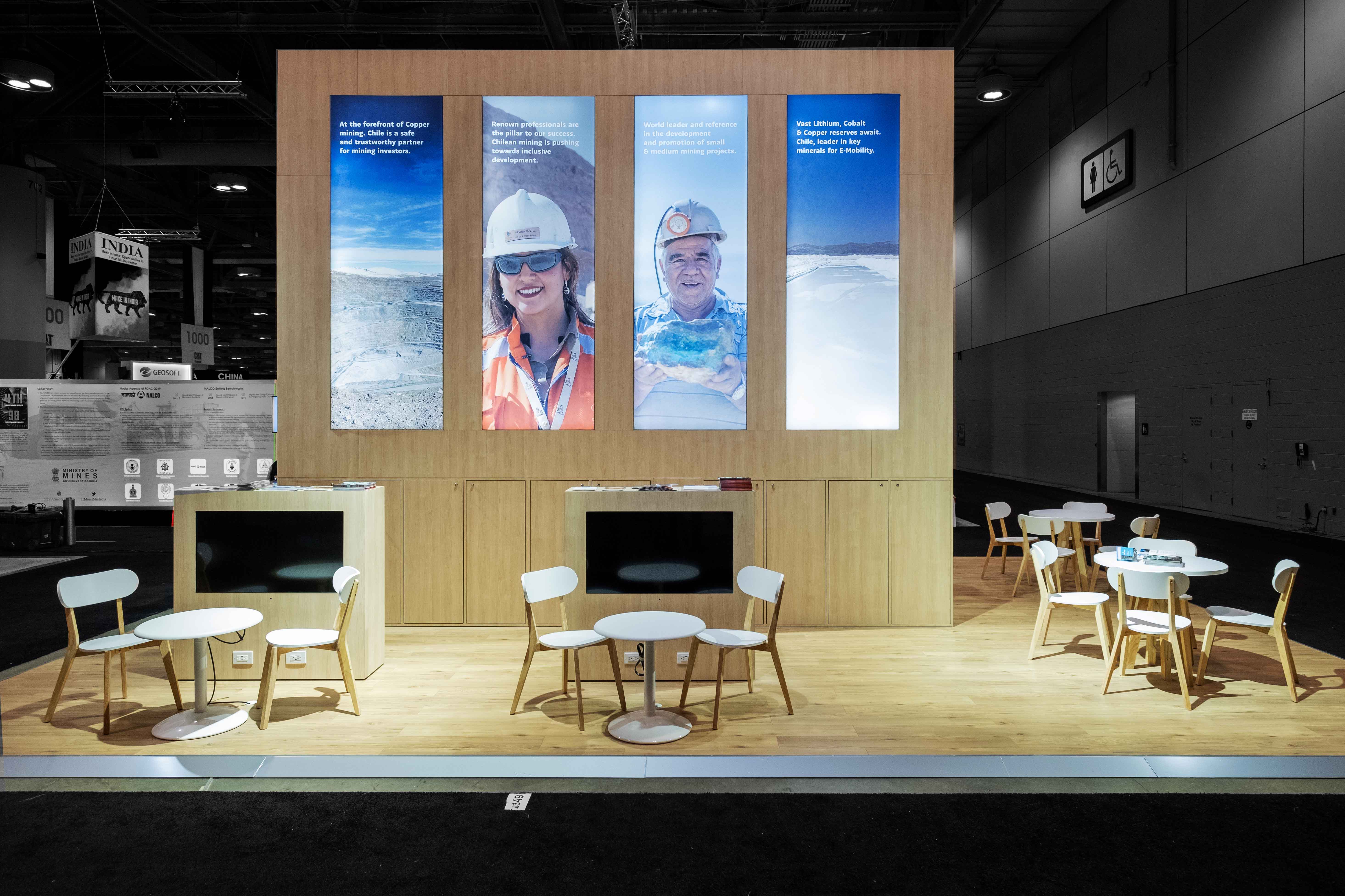 As one of the leading countries in mining, Chile sought a space that would stand out on the busy PDAC international exhibit floor. Their design is governed by a clean aesthetic that effortlessly integrates technology into their uniquely designed, bleached oak, modern space. From 3D design to custom carpentry and production, the Reveal team offered support right through to live activation. The space was flexible, allowing for the large video wall to be used in multiple ways.